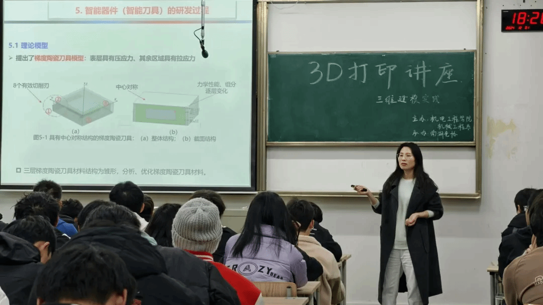 机械工程系何鑫博士先从3D打印基本概念,工艺过程,技术特点和应用领域等方面进行了深入浅出的科普,再介绍了全国三维数字化创新设计大赛竞赛,最后分享了3D打印的科研动态和未来就业的趋势。