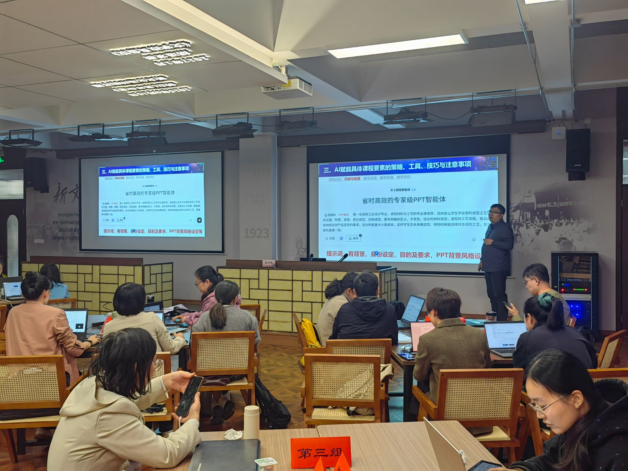 、学生管理等方面的重要性,为各校积极把握人工智能赋能教育教学新机遇,更好运用人工智能推动教育教学改革、丰富教学手段、提升教学实效提供了很好的思路和方法。实操训练环节,石家庄铁道大学张增强教授从人工智能时代的教与学—理念、思路与工具,以及基于超星平台的知识图谱和AI工具集智慧课程建设两个方面,具体分享了智慧课程的内涵、要素、思考框架以及AI赋能具体课程的工具等,示范了知识图谱和各种AI工具的使用方法和技巧,为参会教师带来了一场人工智能赋能教学和智慧课程建设的深度体验,促进了教师人工智能素养的提升。
