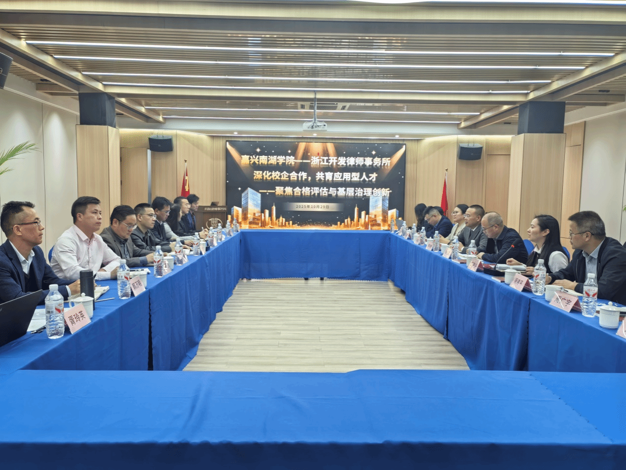为深入落实本科教学工作合格评估要求,强化校外实践教学基地内涵建设,积极探索校企合作赋能基层治理与社会调解的新模式,10月29日下午,校长贾文胜带队赴浙江开发律师事务所调研交流。副校长赵渊,发展规划处、社会合作与国际交流处、人文与艺术学院相关负责人随同参加调研。浙江开发律师事务所主任安玉磊、执行主任郑诗贵等热情接待了我校一行,南湖区副区长王存乡、南湖区司法局副局长祝建平等领导参加了座谈会。