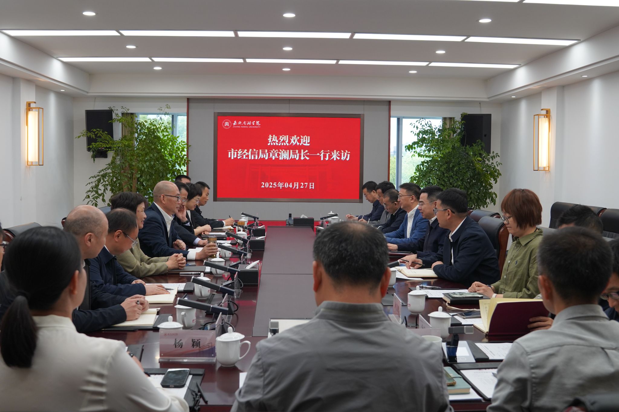 4月27日上午,嘉兴市经信局局长章澜一行来访交流,校党委书记倪沪平接待章澜一行,校领导赵渊、沈岱峰参加座谈。