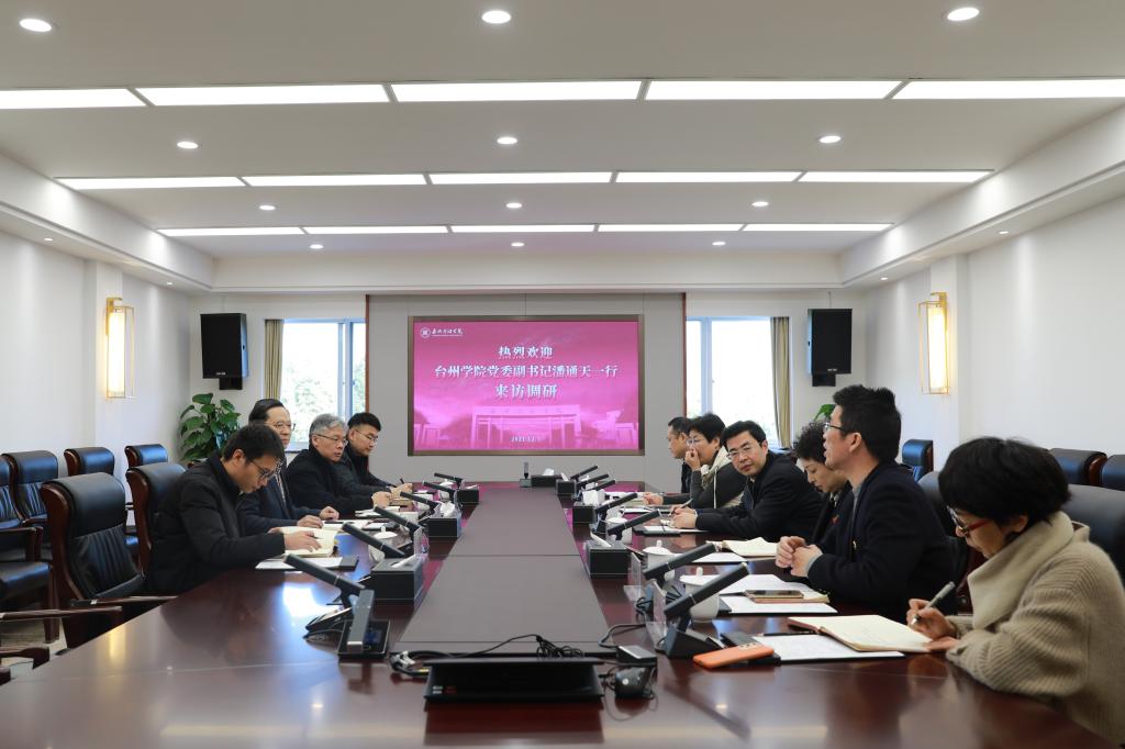 12月3日,台州学院党委副书记潘通天,党委委员、组织部(统战部)部长杨健国一行来校调研。校党委副书记郭坚刚,副校长朱蓉出席调研座谈,组织部、人事处、机关党委、工会负责人参加座谈交流。
