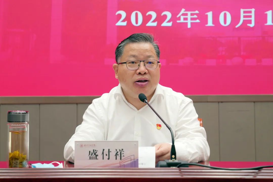 就学习宣传贯彻党的二十大精神,盛付祥要求:一要强化思想引领,领悟精神实质,全面准确掌握党的二十大精神要义。要进一步增强坚决拥护“两个确立”、坚决做到“两个维护”的高度政治自觉,切实把思想和行动统一到二十大精神上来,把智慧和力量凝聚到党中央确定的目标任务上来。二要提高政治站位,积极履职担当,全力组织好党的二十大精神的学习宣传。要切实增强政治意识和责任意识,把学习宣传贯彻党的二十大精神作为当前和今后一个时期最重要的政治任务,加强组织领导、精心部署安排,推动学习宣传贯彻走深走实。三要坚持知行合一,凝聚强大动力,推动学校各项事业高质量发展。强化党建引领,充分发挥以革命红船起航地命名高校的政治担当,切实以党的二十大精神全面指导办学治校、管党治党,认真落实新时代党的建设总要求,坚定不移推进全面从严治党,努力推动学校改革发展落地见效。
