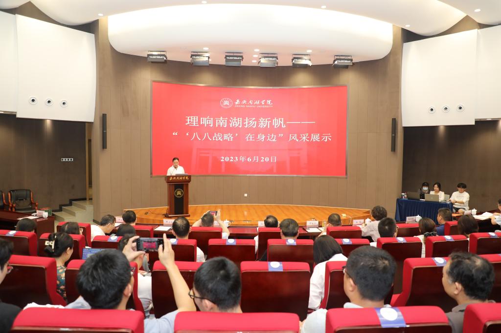 6月20日下午,理响南湖扬新帆——“‘八八战略’在身边”风采展示活动在学校第一报告厅举行。校领导盛付祥、贾文胜、胡文蔚、蒋文波、朱蓉、李泉明、陈加明、蒋娟芬、庄应强出席活动。相关职能部门负责人,各二级学院书记、副书记,全体思政课教师、辅导员、宣讲员参加活动。