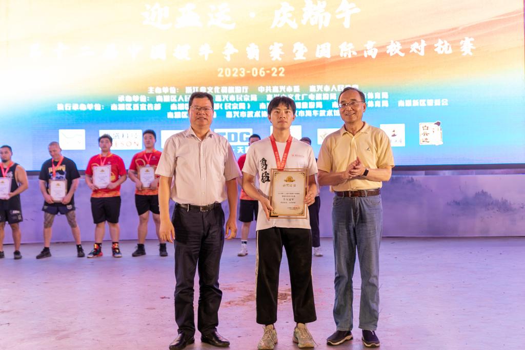 总决赛分设个人总决赛和国际高校对抗赛两个项目,共有来自江苏、浙江、上海以及新西兰的6所高校,40多名运动健儿参加。我校“勇猛精进掼牛队”在教练戴丹婷老师指导下,派出了杨鹏辉、韩李涛、周冠鹏、董文凯四名同学参加本次掼牛比赛。经过激烈角逐,来自时尚设计学院的杨鹏辉同学夺得个人总决赛的冠军。
