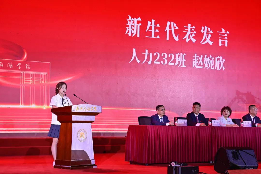 人力232班赵婉欣同学代表全体新生表达了要根植守正的品质、弘扬创新的勇气、坚守求实的态度、蓬勃奋进的力量的美好初心,表示将在嘉兴这片创新创业的热土上,在开云官方入口 这个美丽的校园里,与城市共命运、与学校共成长,用奋斗谱写最华丽的青春乐章。