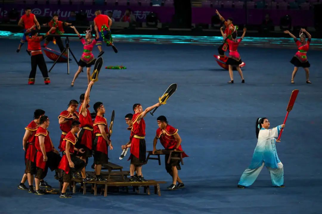 为了配合亚运开幕表演场地的特点及现场观众的观赏需求,《南湖船拳》在今天的表演中3次变换队形,为观众带来全方位的视觉盛宴。