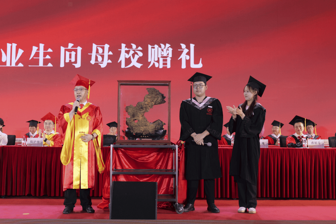 校长、党委副书记贾文胜代表学校接受2024届毕业生代表捐赠的纪念品,并寄语全体毕业生带着南湖的梦想,迎风飞扬,让生命怒放,让成功启航。