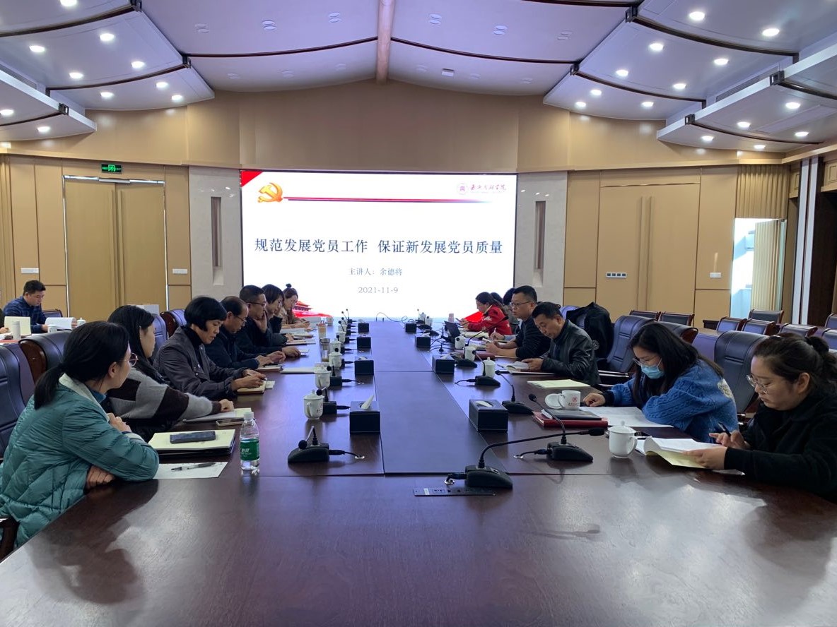 为深入贯彻新时代党的建设总要求和党的组织路线,持续推进发展党员工作标准化规范化建设, 11月9日下午,党委组织部在第六会议室召开党员组织发展工作专题培训,机关党委负责人余德将作专题报告。各二级学院党委副书记,学生党支部书记、副书记参加会议。